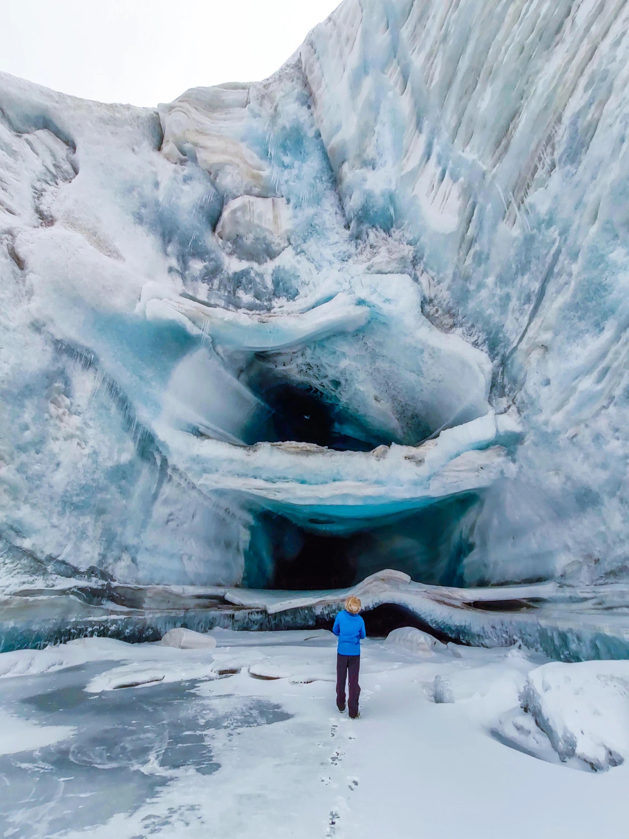 On the glacier at the top of the mountain, a dark natural ice cave was found, nearly ten metres high, with three layers and smooth, transparent walls of ghostly blue ice. When I later showed the photos to the Locals, they also found it very impressive.