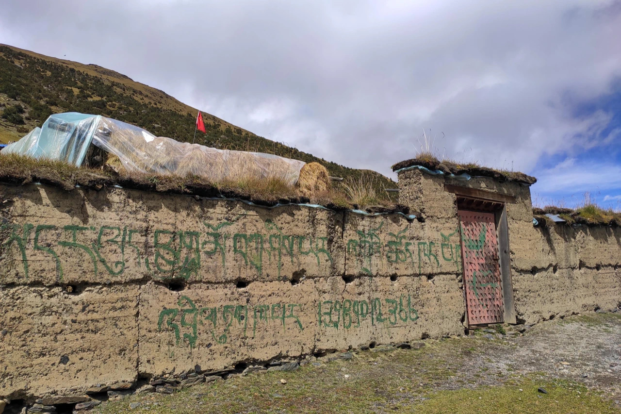 I saw a smashed wooden house, as if it had been struck by some huge object, with only one pillar standing there, on which hung a yak skull inscribed with scriptures, as if it were a totem. Several hundred metres of the mountainside behind the house had been cut down to nothing but stumps and hung with sutras.