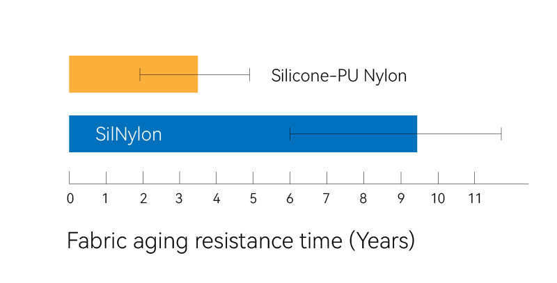 The aging performance of Silicon-PU Nylon in this data is based on our years of repairing tents in the Chinese market, including PU Nylon of brands such as MSR\BigAgnes\3FULGEAR, etc.