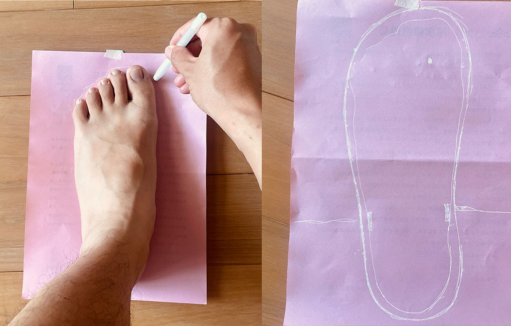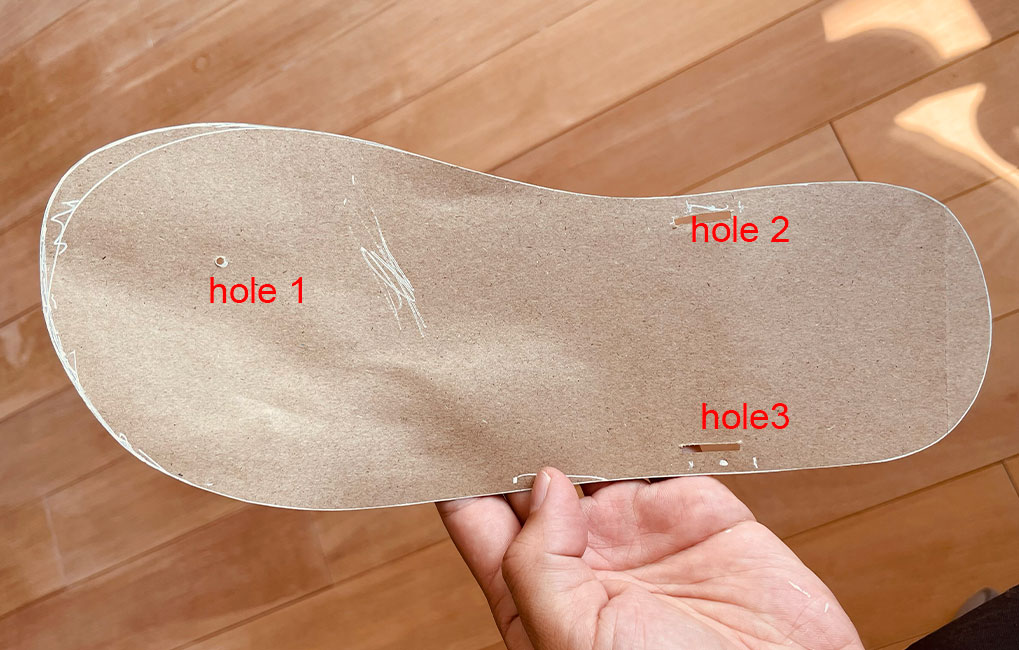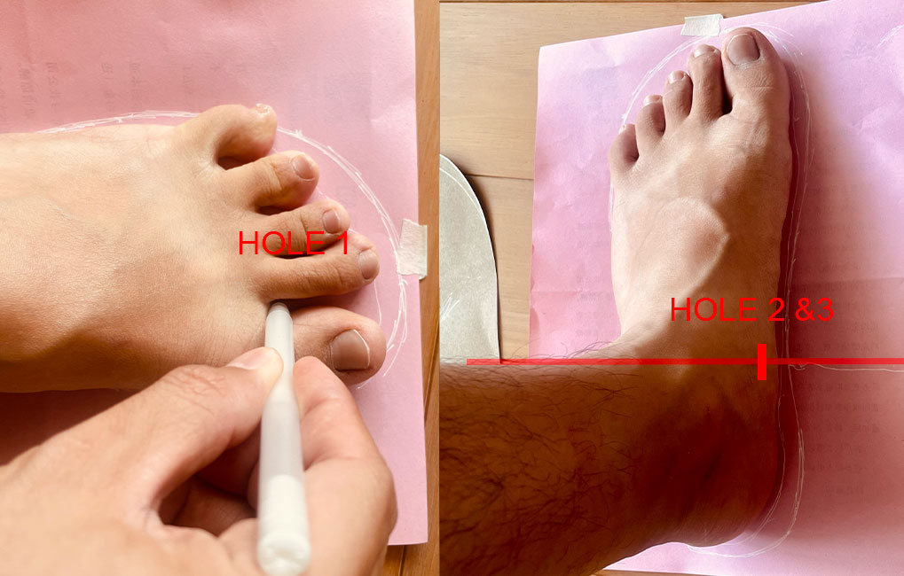 3. Determine the location of the 3 holes, the first one is the hole next to your big toe, use a pen to point a dot. The second and third holes should be determined according to the position of the very front of your calf shin, draw a line on the paper flush with the front of the shin, move 1 cm inside the sole according to this line, this is the location of the string, determine the size of the holes according to the width of the webbing you use.