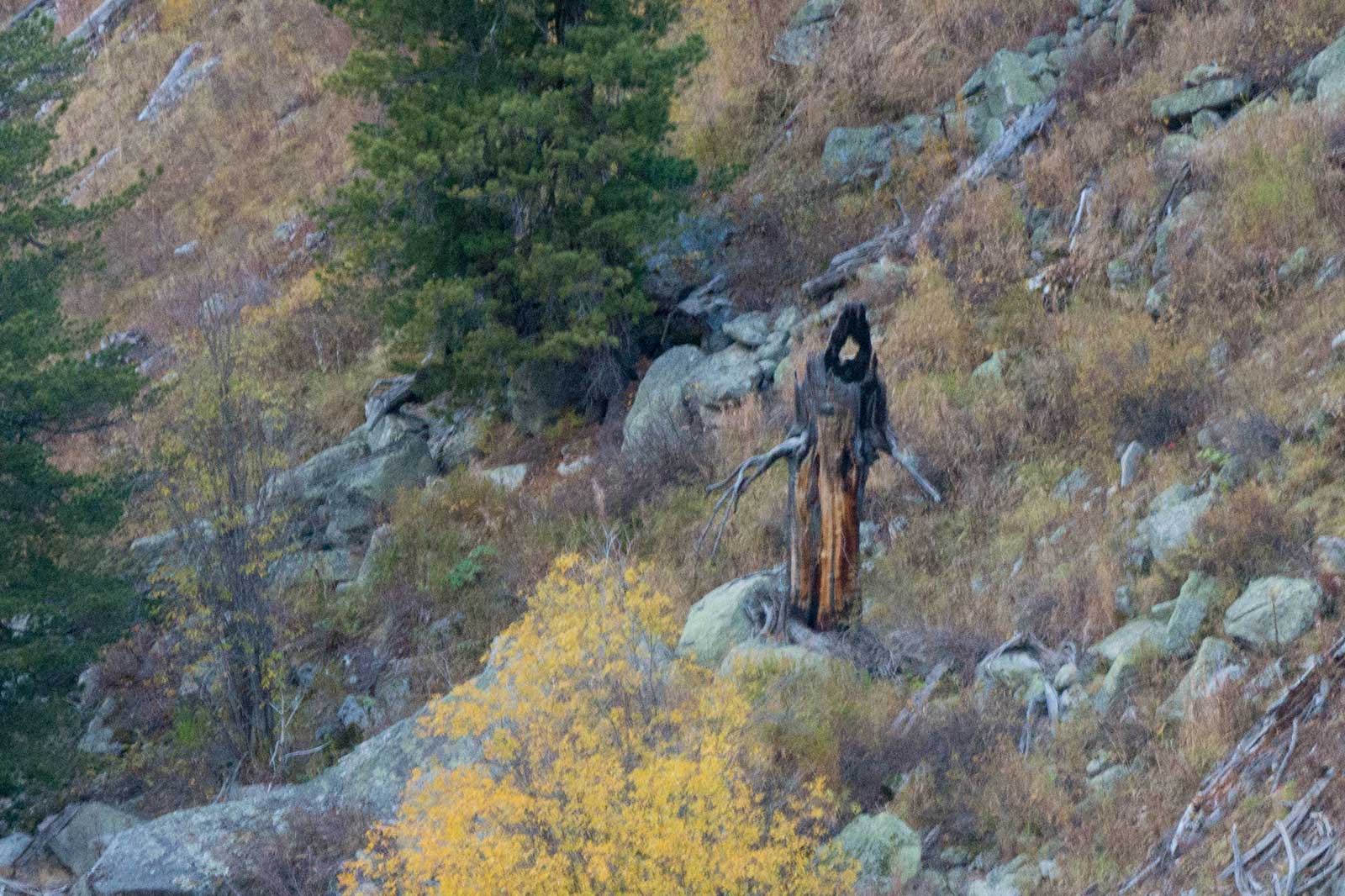 After entering the Sumu River Valley, we used our packrafts to cross the river from the west bank to the east bank at approximately 48°45.8 N, 87°33.5 E. We crossed to bypass a 500-meter-high slope about 6 km ahead, which would allow us to avoid a high-drop section of the Sumu River. Before the slope, we passed a burned slope where the trees had been killed by a wildfire.